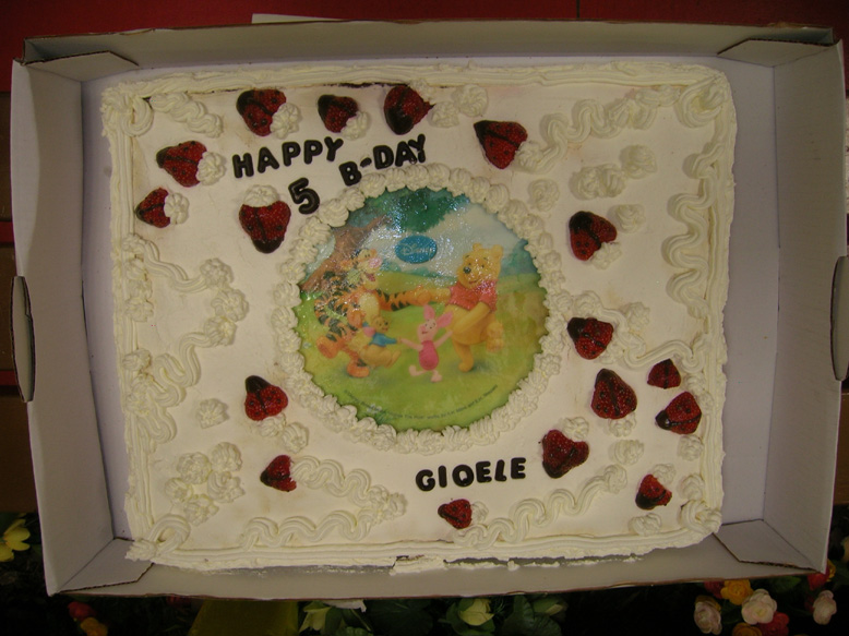 Per Gioele, il tornato in voga, il buffo Winnie The Pooh: con scritta alla simmy e decorazioni fantastiche adocchiate sulla rete e semplicissime da rifare; fragoline diventate coccinelle.