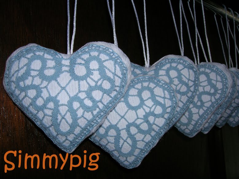 Questi sono i venti cuoricini strapieni di lavanda con un applique fatto a TOMBOLO, creati per festeggiare il primo compleanno di Michele.