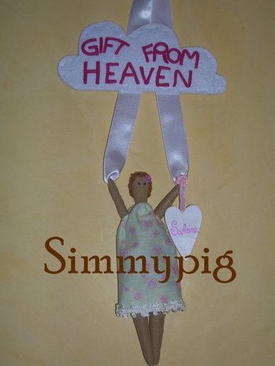 In attesa del resoconto della mia partecipazione alla Fiera di COLLI, vi mostro questi fiocchi nascita, nati dalla frase scritta sulla nuvola, oggetto del mio titolo.UN DONO DAL CIELO che scende con una nuvola come fosse un paracadute..un tildina..un cuore dove scrivere il nome della nuova arrivata ^__^